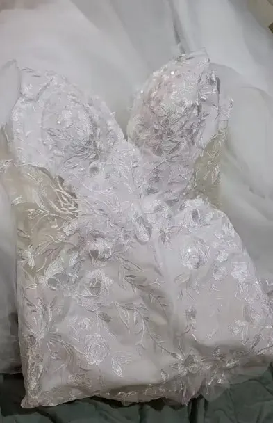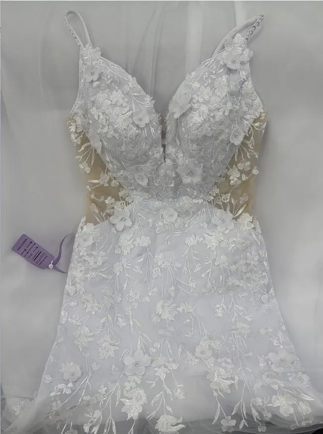 The fitted bodice highlights your natural curves with a flattering V-neckline, while the open back adds a touch of alluring refinement. Crafted from lightweight tulle and soft lining, the gown offers all-day comfort without sacrificing elegance.