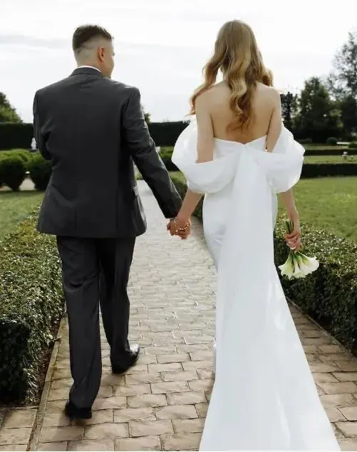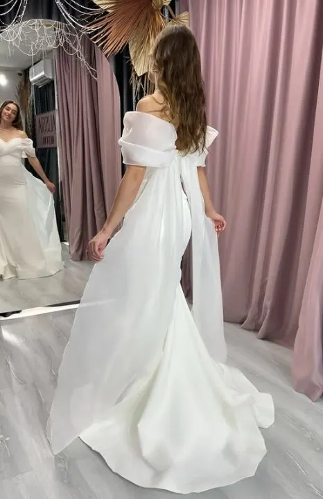 Crafted with premium stretch satin and layered tulle, the dress offers comfortable movement without compromising the sleek contour. A subtle back train completes the design, adding an elevated finish suitable for bridal portraits, receptions, evening events, and formal ceremonies.