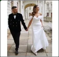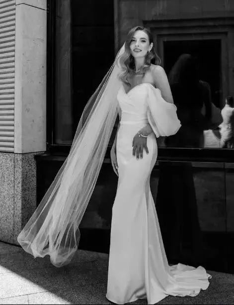 A refined blend of romance and modern tailoring, this gown features a sculpted mermaid silhouette with an off-the-shoulder sweetheart neckline. The sheer tulle sleeves create soft volume, while the fitted bodice and structured skirt highlight the natural waist and create a smooth, elongated shape.